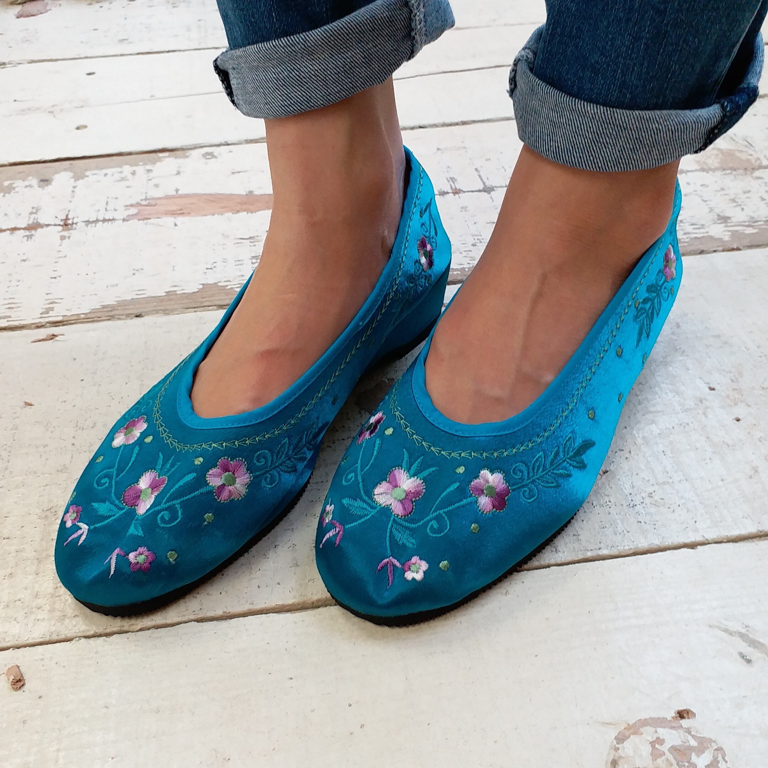 青のサテン生地に刺繍の入ったヒールのチャイナシューズです。綺麗な色は海外ならでは。