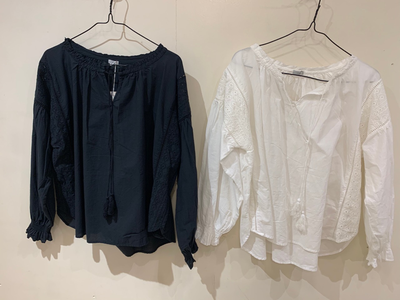 部分的にレースが施されたプルオーバーブラウスは春にぴったり。