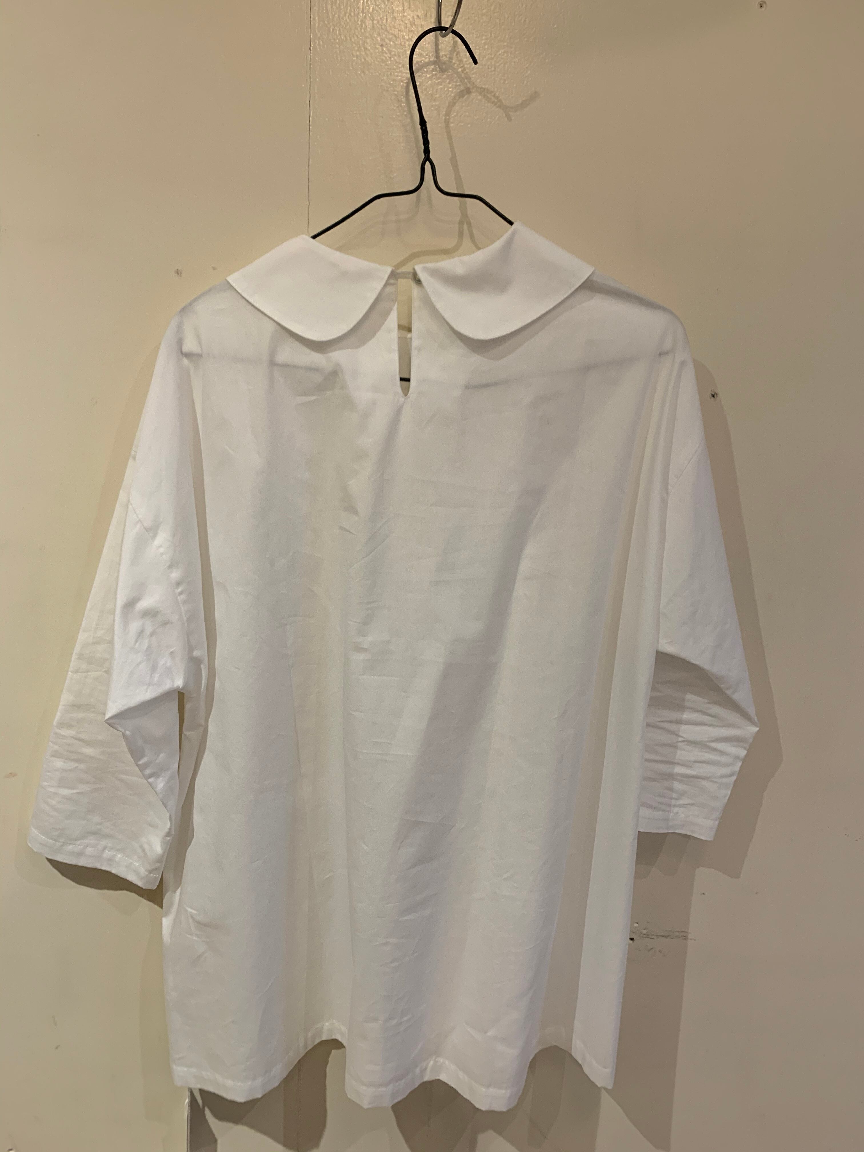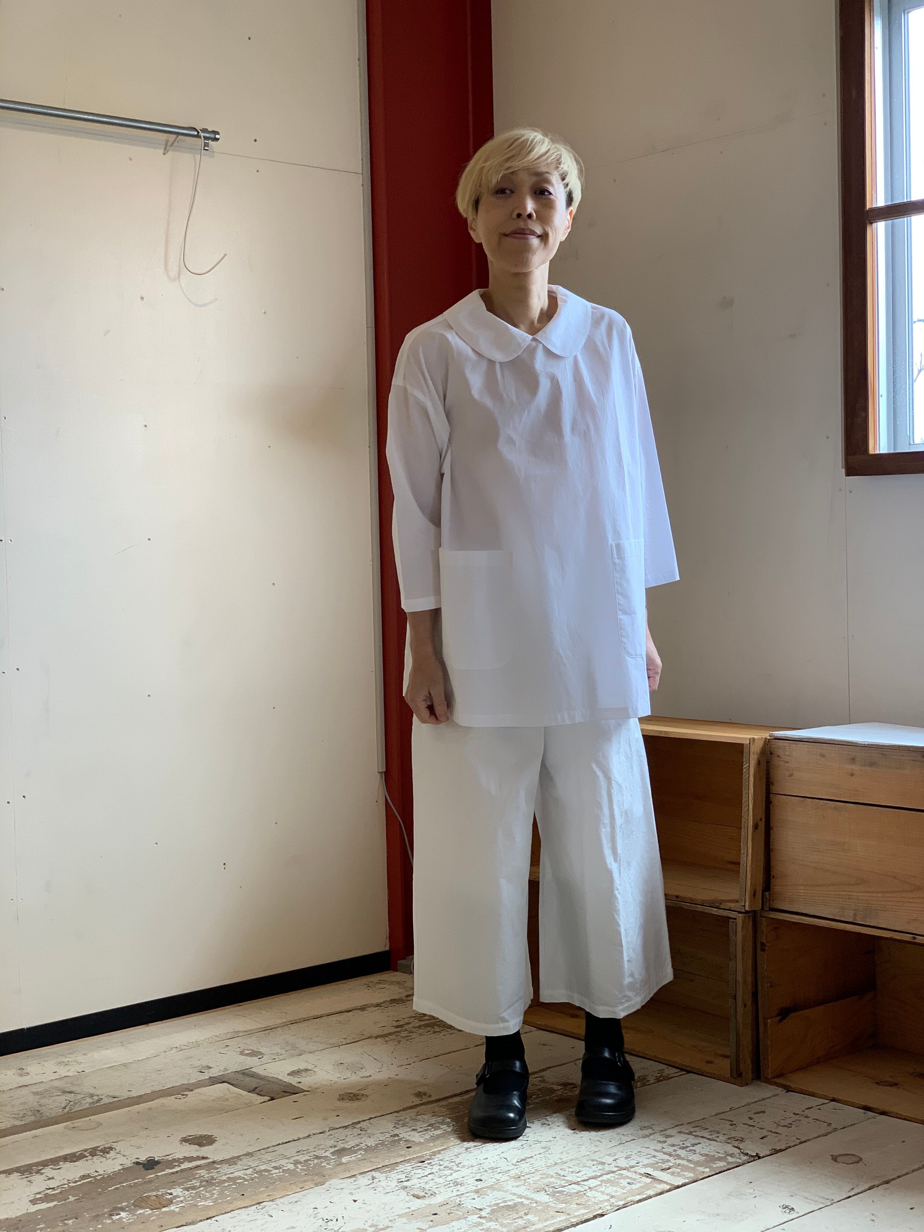 お馴染みの大きな丸襟ブラウス、この春は少し長めの丈にポケットが二つ。大人の女性を可愛く見せてくれます。