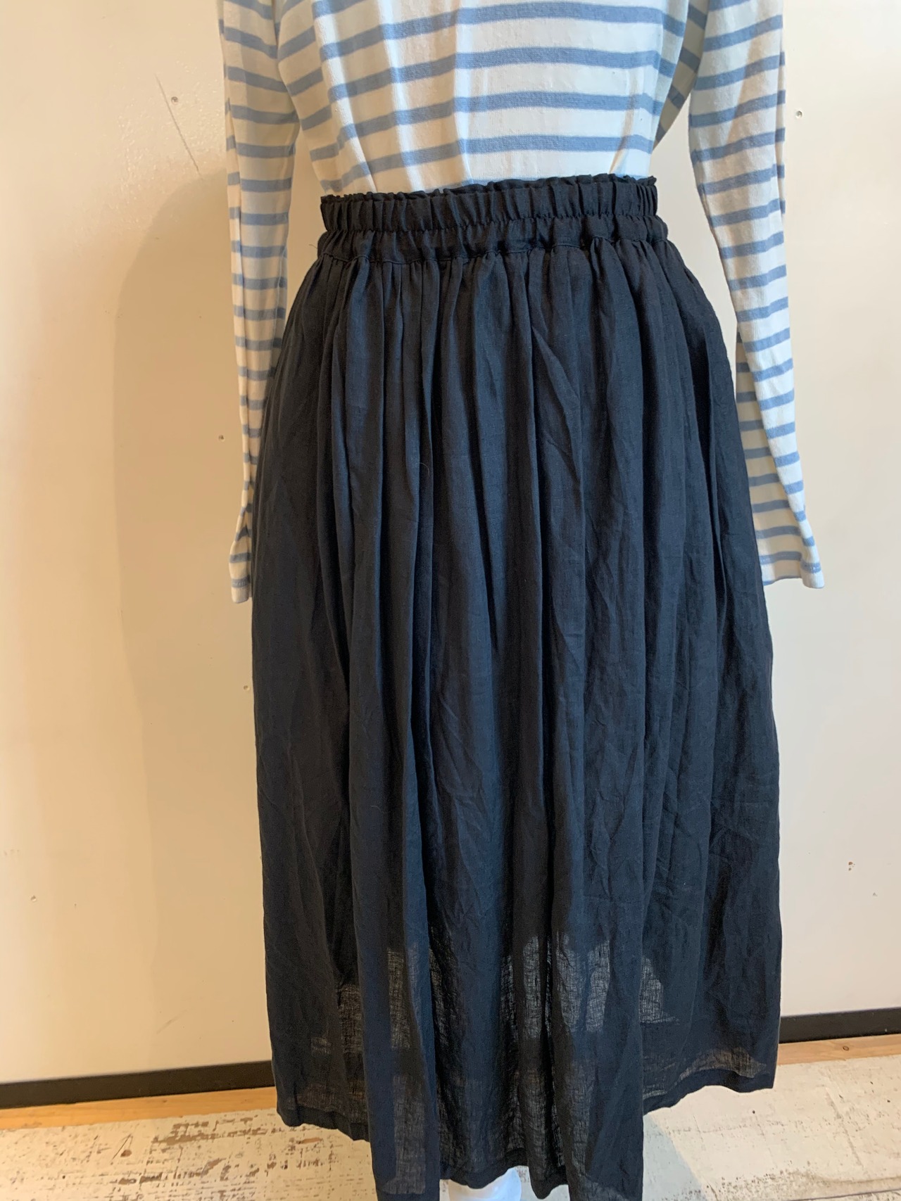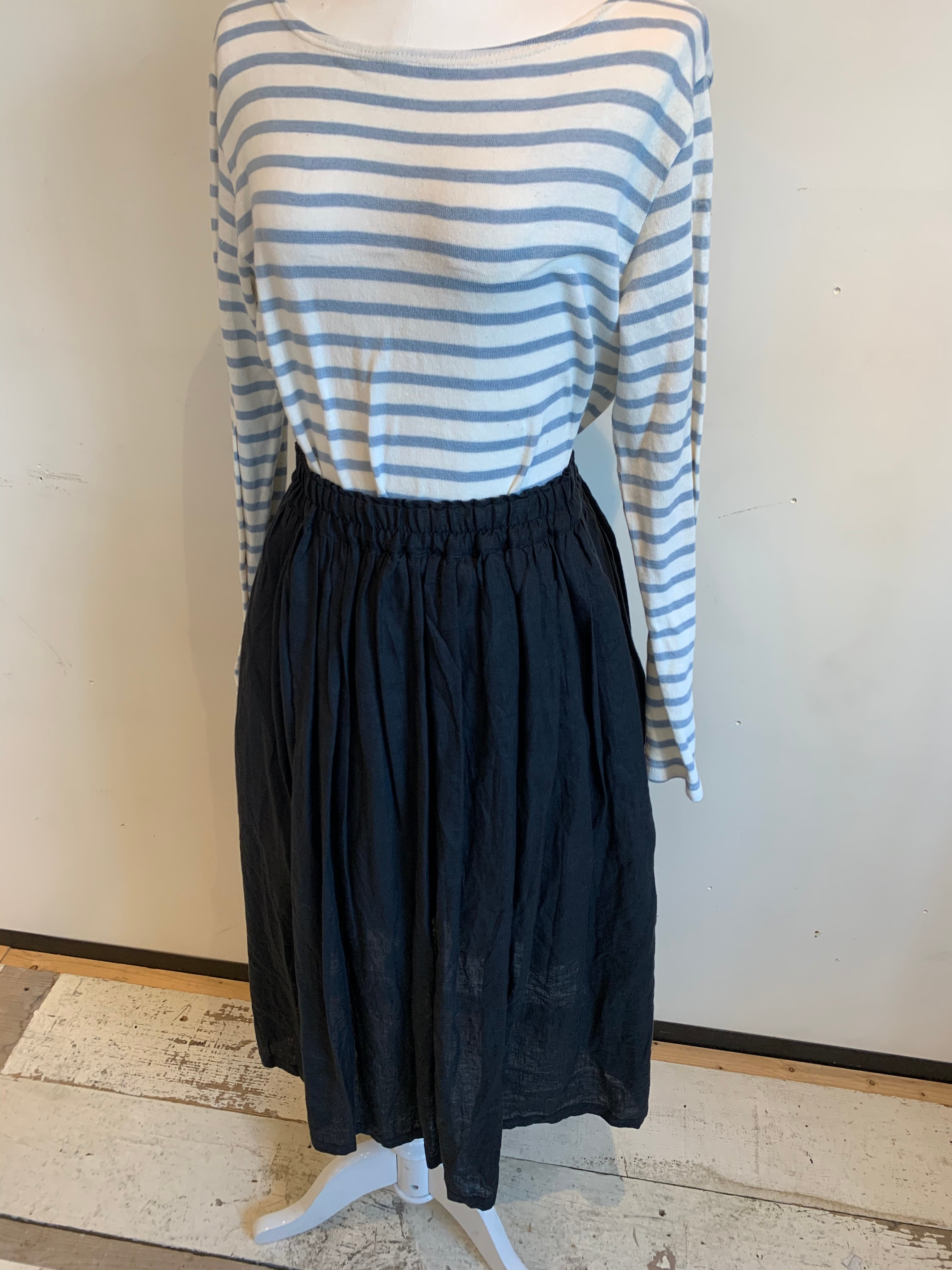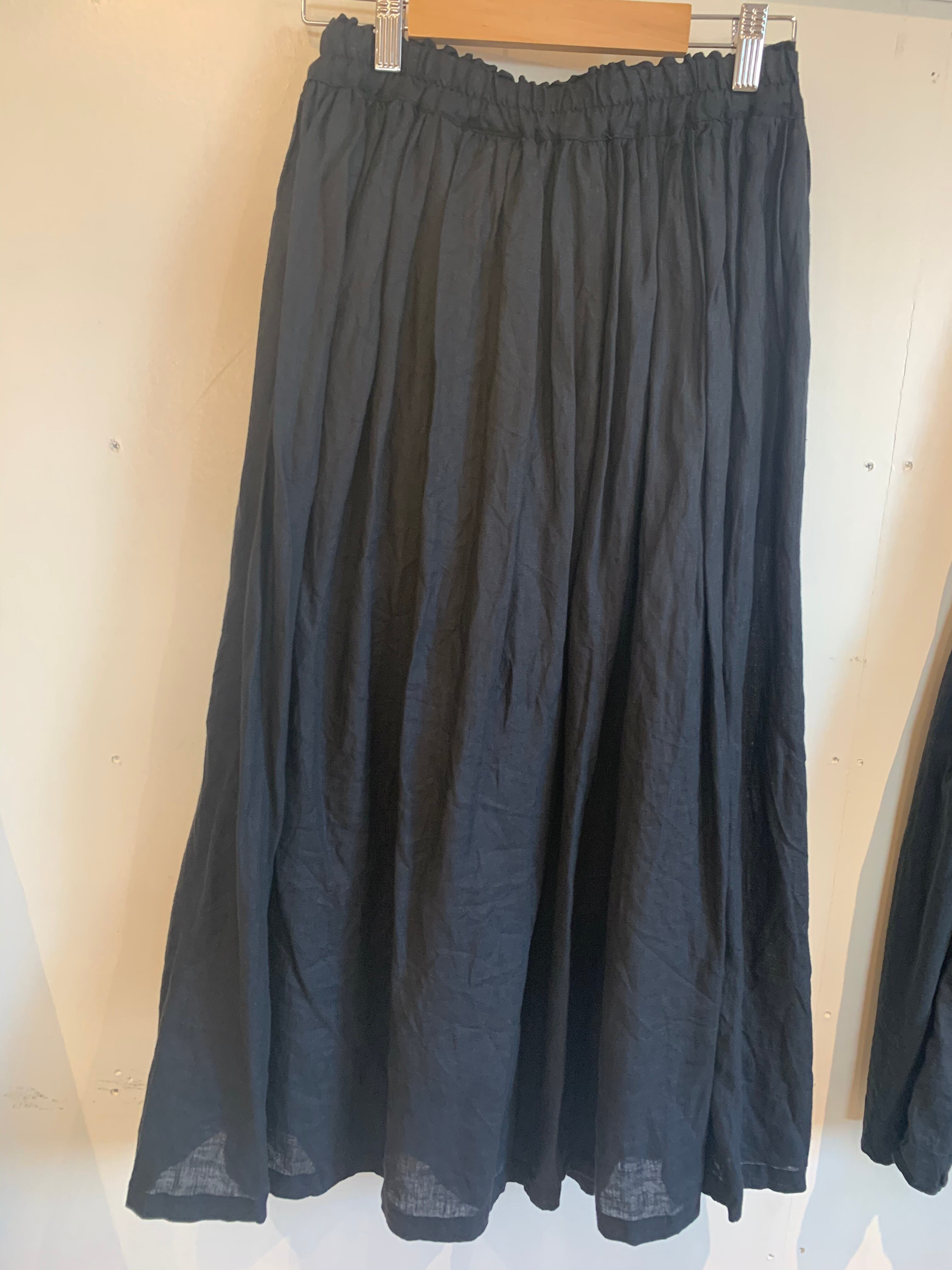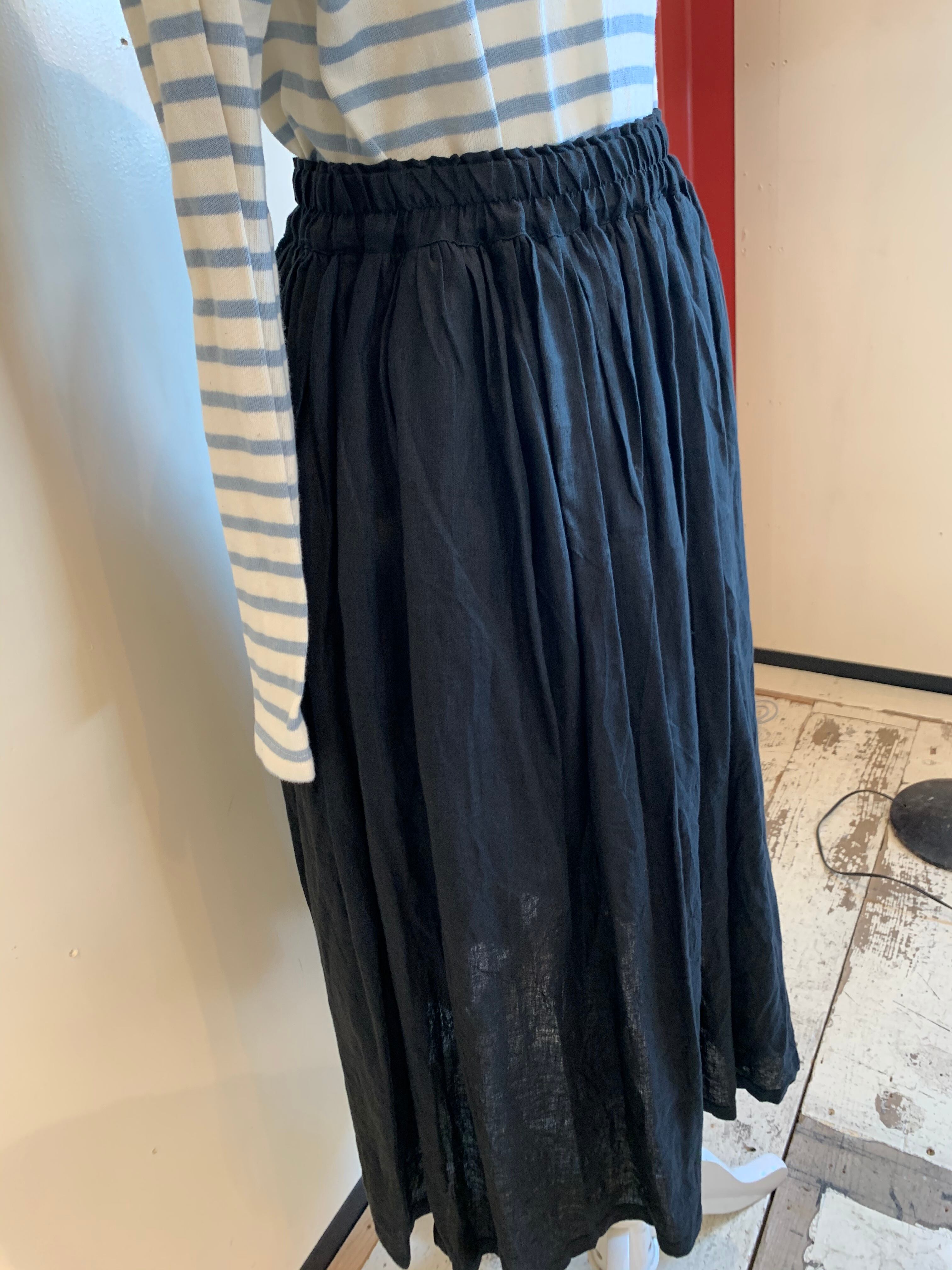 麻の黒いスカートというアイテムは、コーディネートの要として一年中活躍します。