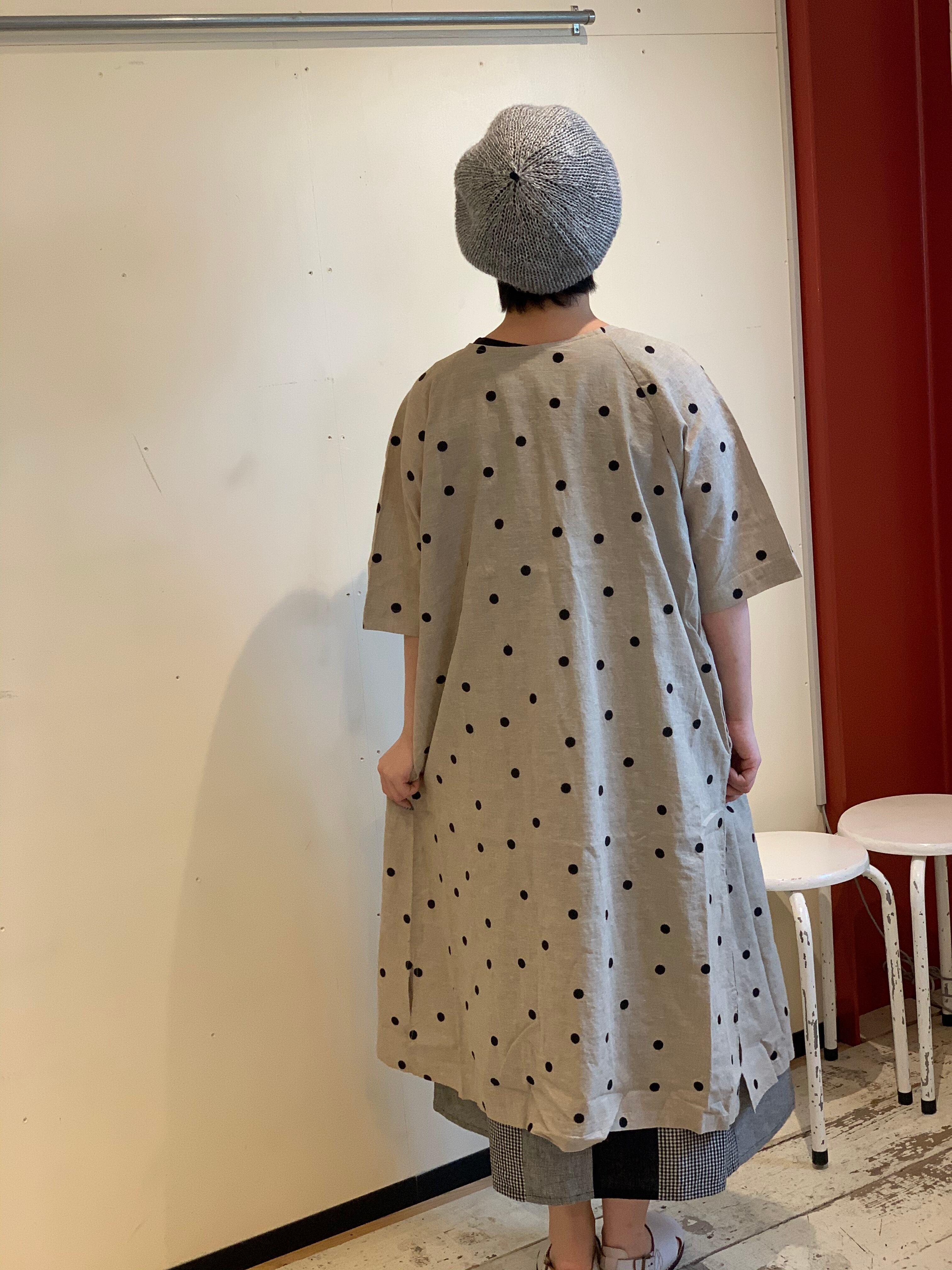 全体がドット刺繍のワンピースは前を開ければ羽織りコート風、ボタンを後ろに着るとワンピースになる優れものです。