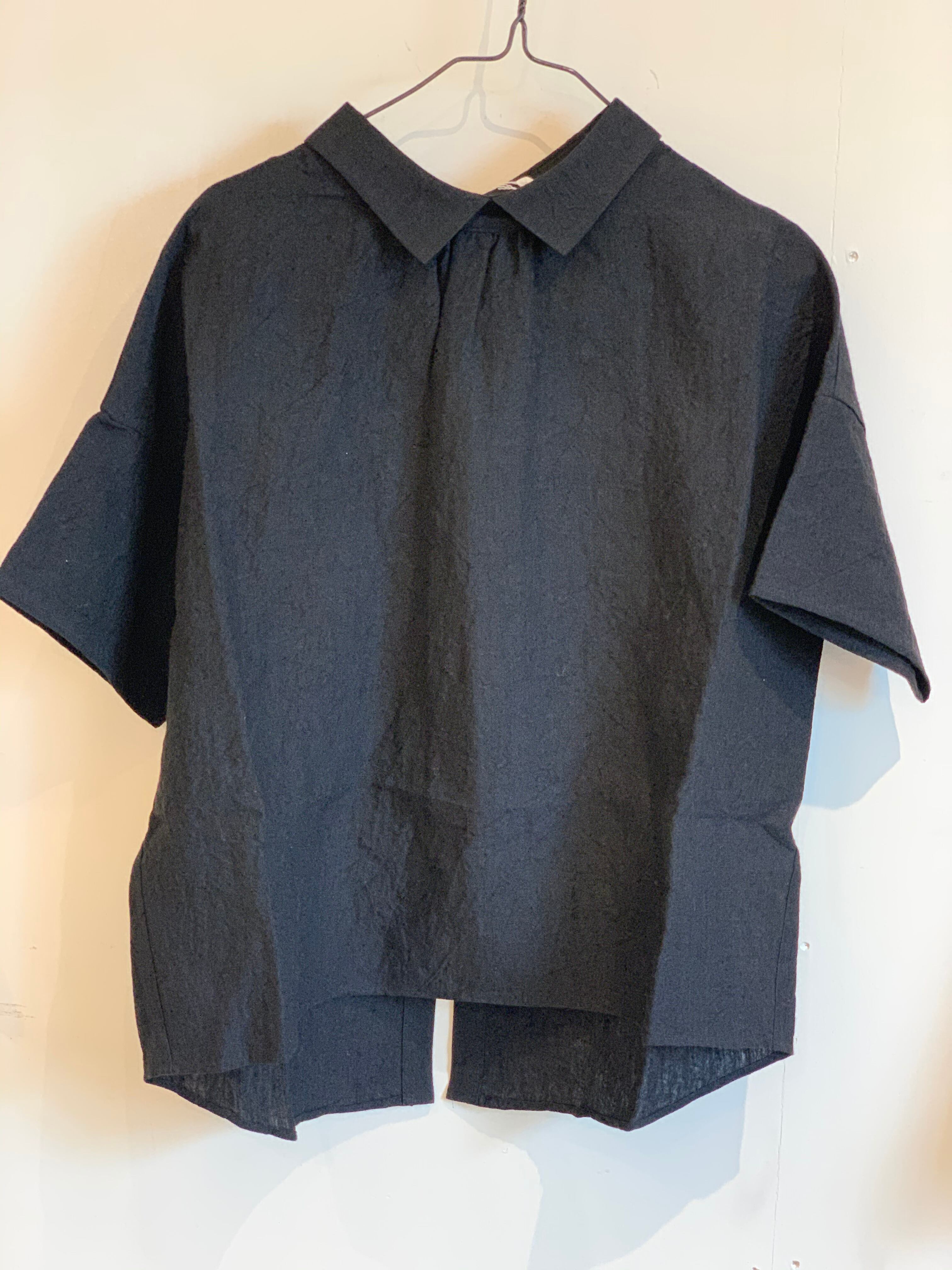 前後着用OK。ボタンを後ろにすると襟元のギャザーが可愛いブラウスになり、後ろはインナーをチラ見せできます。