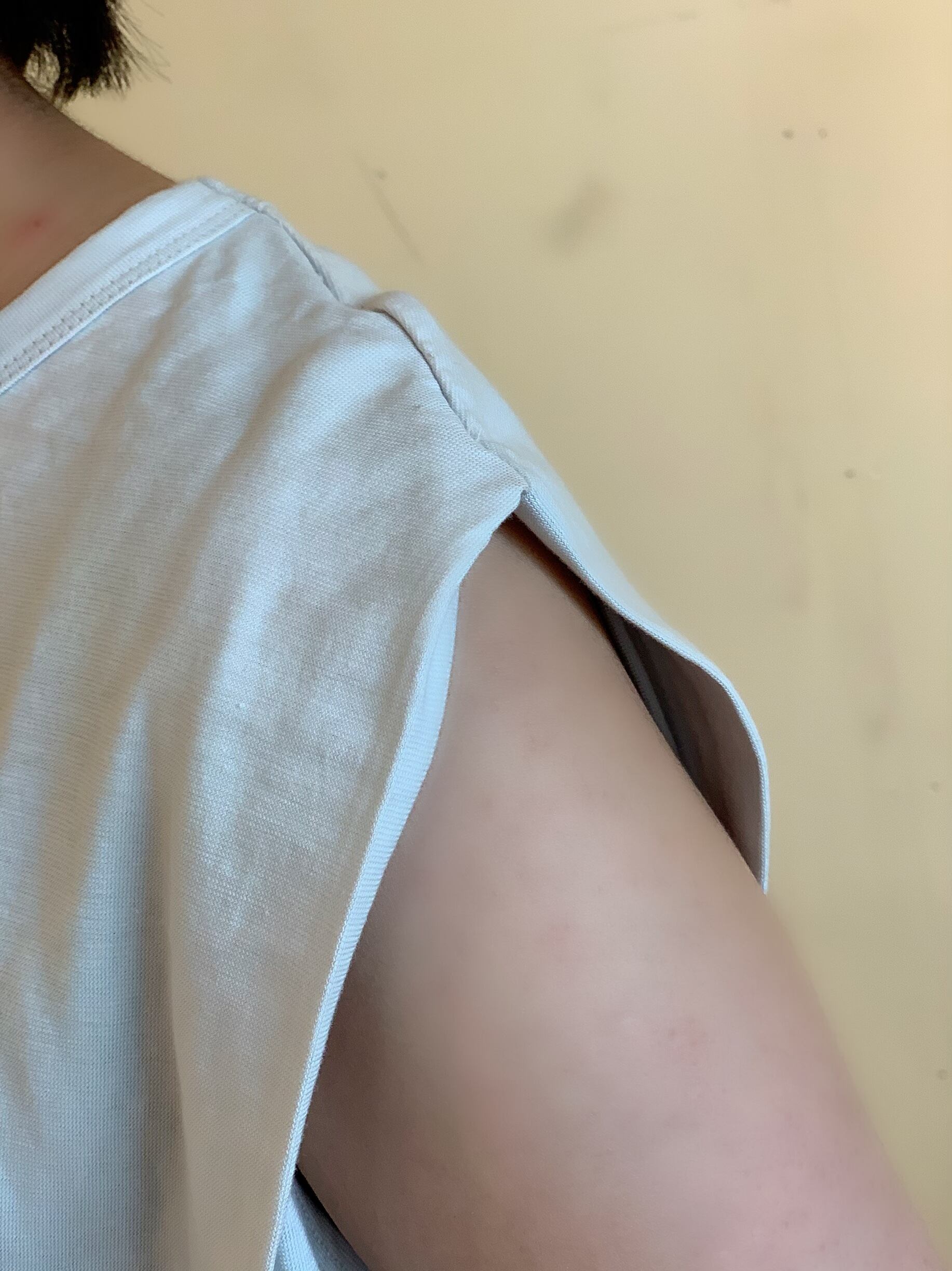 とてもソフトで着心地の良いノースリーブトップス。肩のところから立体になっていて腕が細く見えます。