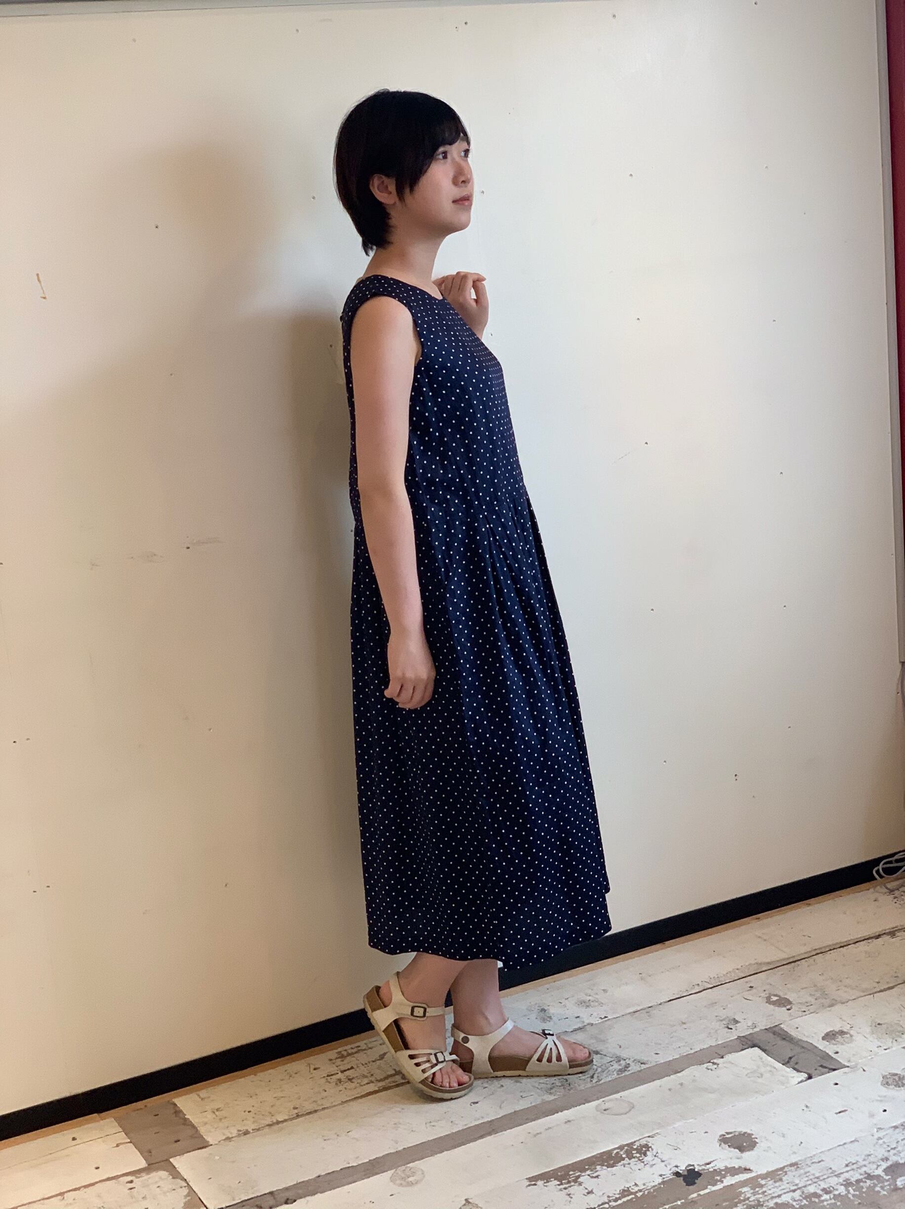 上品なピンドットのワンピースはお出掛け着として使えます。