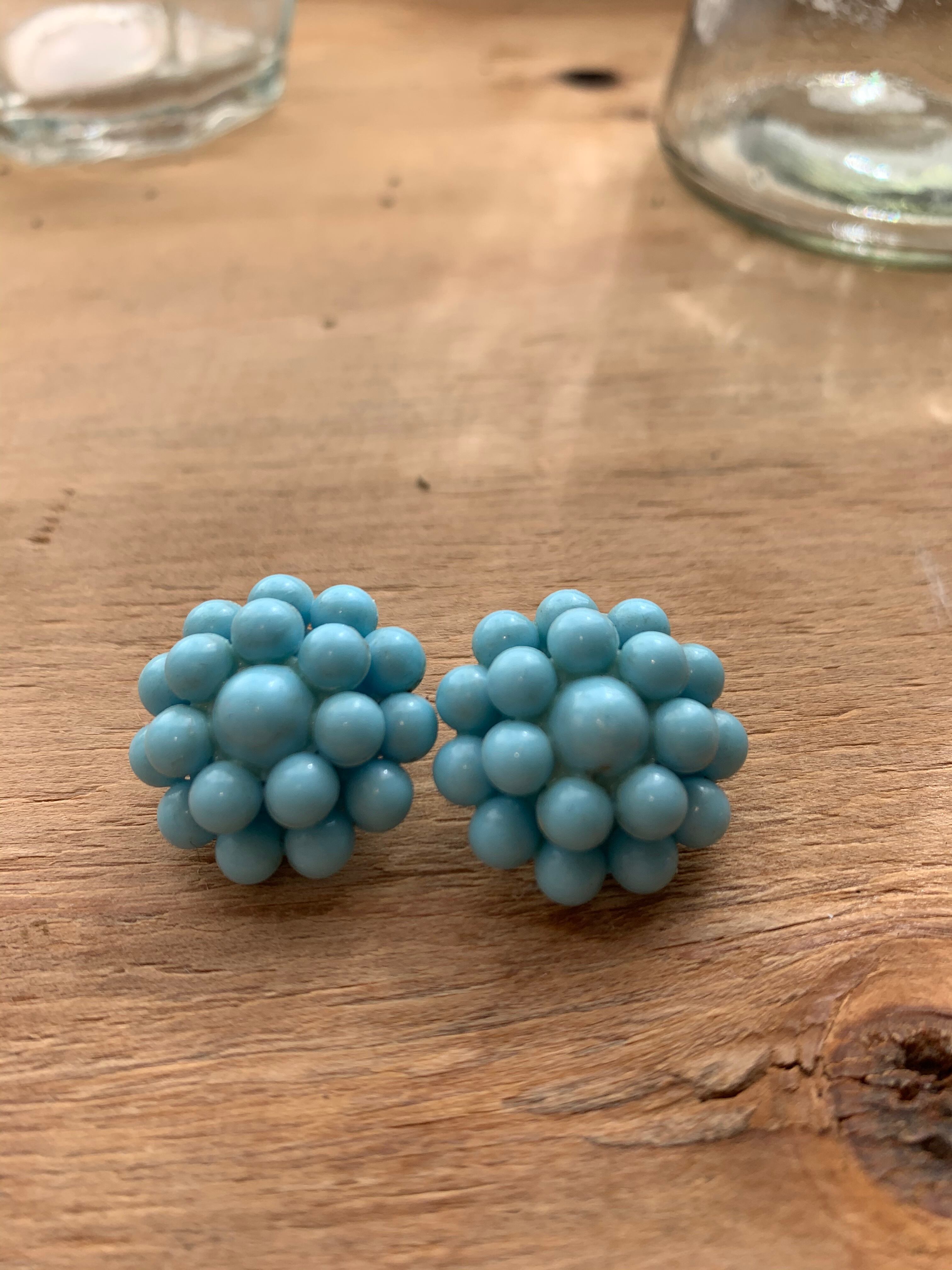 パリ 水色のビーズ花イヤリング