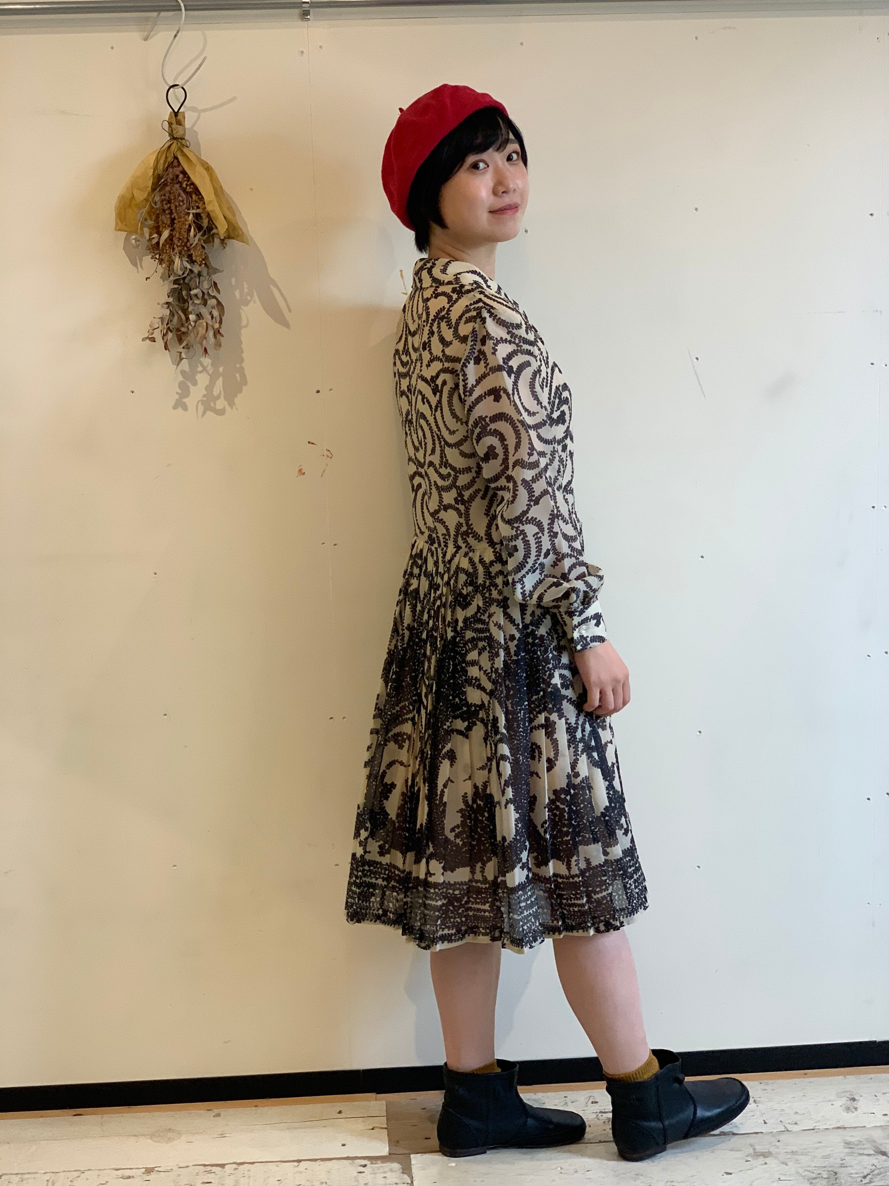 ややシースルー感があるエレガントな柄と生地のワンピースです。スカート部分のプリーツも綺麗でとても上品です。